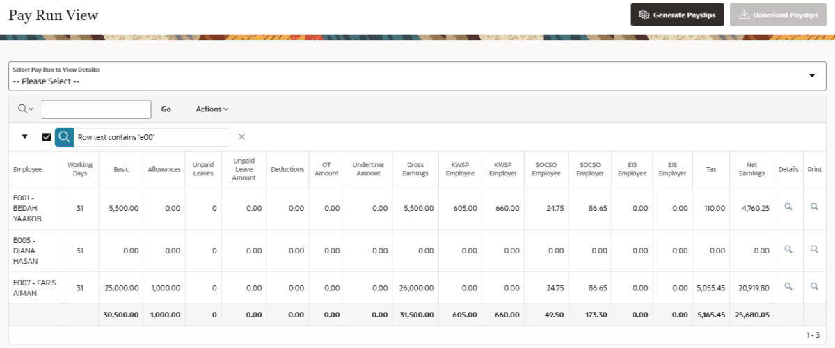 With ‘Pay Runs View’ in our HR software, gain a detailed and transparent overview of your payroll processing in Malaysia. Access and review pay runs effortlessly, ensuring accuracy and compliance. Customize settings, track deductions, and generate reports seamlessly. Elevate the HR payroll system in Malaysia with real-time insights, enhancing financial precision and employee trust in your organization.